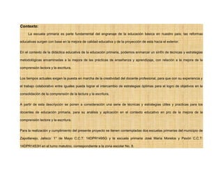 Este documento presenta un proyecto para mejorar la comprensión lectora en la escuela primaria con el apoyo de las TIC. El proyecto propone el uso de modalidades y estrategias de lectura para diferentes grados, así como recursos tecnológicos como wikis y videos de YouTube. El objetivo es lograr el dominio de la lectura y escritura en los alumnos a través de la aplicación de estas técnicas. Se evaluará el trabajo con rubricas para maestros, alumnos y la forma de trabajo de las modalidades.
