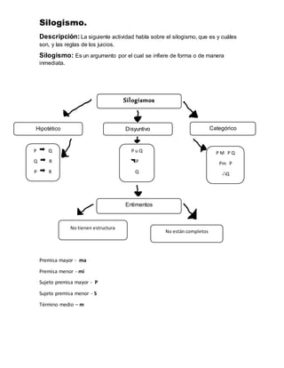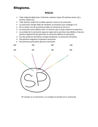Este documento habla sobre el silogismo, que es un argumento lógico donde se infiere una conclusión a partir de dos premisas. Explica que un silogismo tiene tres términos: el sujeto de la premisa mayor, el sujeto de la premisa menor y el término medio. También enumera las reglas que debe seguir un silogismo para ser válido, como que el término medio no puede aparecer en la conclusión y que al menos una premisa debe ser universal.
