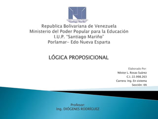 Este documento presenta conceptos básicos de lógica proposicional, incluyendo tipos de proposiciones, formas lógicas y sus símbolos, tablas de verdad, propiedades de operadores lógicos y diagramas de Venn. Explica proposiciones atómicas y moleculares, operadores como negación, conjunción, disyunción, condicionales y bicondicionales. También cubre implicación tautológica y equivalencia tautológica.
