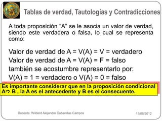 El documento resume los conceptos básicos de las tablas de verdad, tautologías, contradicciones y conectivos lógicos como la negación, disyunción inclusiva, disyunción exclusiva, conjunción, condicional y bicondicional. Explica cómo construir tablas de verdad para proposiciones compuestas y determinar si son tautologías, contradicciones o contingencias. También presenta ejemplos de tablas de verdad y esquemas moleculares.