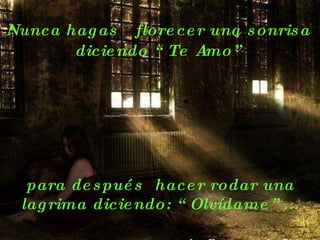 El documento habla sobre la importancia del amor y la amistad. Aconseja no hacer sufrir a otros con promesas de amor que luego se olvidan, y que las lágrimas de dolor duelen más que las físicas. También enfatiza que los amigos de verdad dejan huellas en el corazón y que la vida es un regalo que hay que vivir en el presente apreciando a quienes nos rodean. Finalmente, invita a demostrar a los amigos cuánto nos importan.