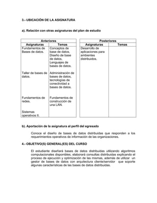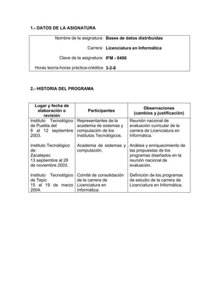 Este documento presenta la información sobre una asignatura de bases de datos distribuidas. Incluye detalles sobre el nombre, clave, créditos y horario de la asignatura, así como su historia, ubicación en el plan de estudios, objetivos, temario, aprendizajes requeridos, sugerencias didácticas, sugerencias de evaluación y unidades de aprendizaje.