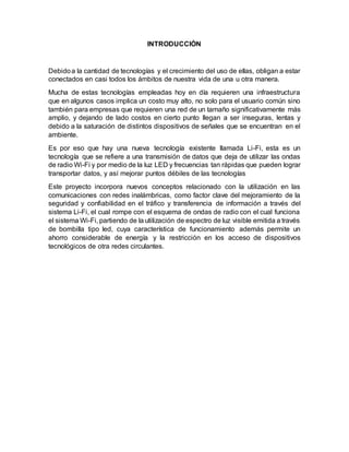 El documento presenta la tecnología Li-Fi, que utiliza luz LED para la transmisión de datos, ofreciendo una alternativa más segura y eficiente en comparación con el Wi-Fi. Esta innovación busca mejorar la infraestructura de redes inalámbricas y tiene el potencial de reducir costos y el impacto ambiental. Se destaca la importancia de estar al tanto de tecnologías emergentes que promuevan un desarrollo sostenible en la sociedad moderna.