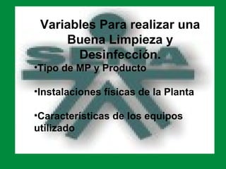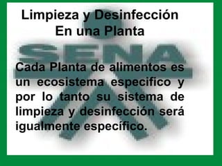 Este documento describe los procesos de limpieza y desinfección en plantas de alimentos. Cada planta requiere un sistema específico debido a factores como el tipo de producto, instalaciones y equipos. La limpieza implica eliminar la suciedad visible mediante fregado y lavado con detergentes apropiados, mientras que la desinfección busca eliminar microorganismos restantes. El documento clasifica y explica los agentes de limpieza y desinfectantes comúnmente usados, así como las etapas típicas de un programa de limp