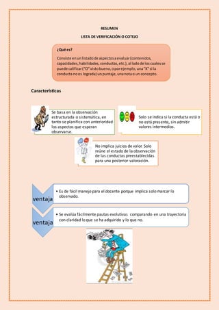 La lista de cotejo es una herramienta de evaluación que consiste en una lista de aspectos preestablecidos a observar, junto a los cuales se marca si la conducta está o no presente sin valoraciones intermedias. Se basa en una observación sistemática planificada por adelantado y solo indica la presencia o ausencia de lo observado sin juicios de valor. Permite evaluar fácilmente el progreso comparando lo adquirido en el tiempo y ayuda a los docentes al requerir solo marcar lo observado.