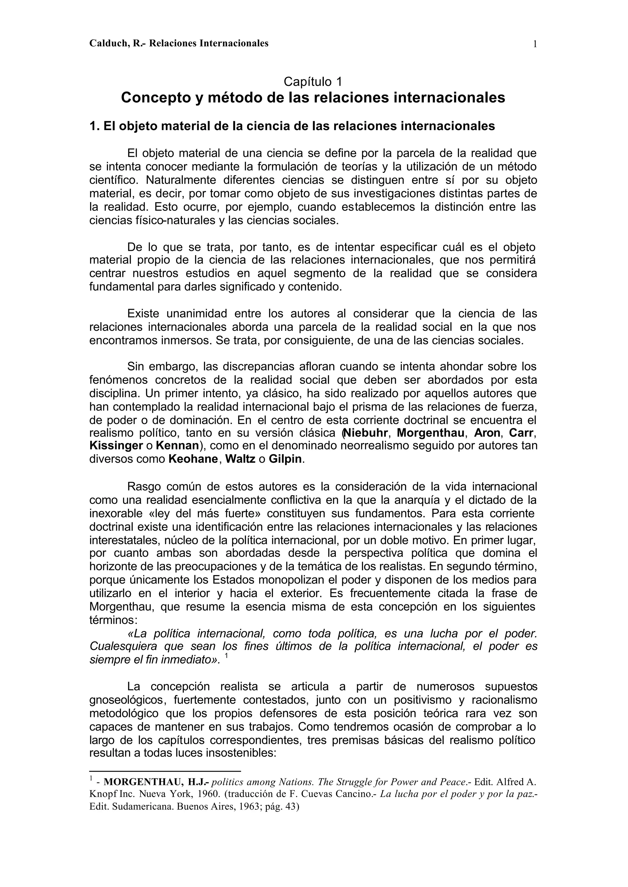 El documento aborda el objeto material y formal de la ciencia de las relaciones internacionales, enfatizando su naturaleza como parte de las ciencias sociales. Se explora la concepción del realismo político dentro de esta disciplina, destacando su enfoque en las relaciones de poder y conflicto, a la vez que se critican sus limitaciones teóricas. Finalmente, se discuten diferentes enfoques para definir la internacionalidad y la relevancia de las relaciones sociales que constituyen el objeto de estudio de las relaciones internacionales.