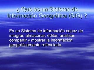 Un Sistema de Información Geográfica (SIG) es un sistema que permite integrar, almacenar, editar, analizar, compartir y mostrar información geoespacial. Un SIG puede ser utilizado para investigaciones científicas, gestión de recursos, planificación urbana y viticultura, entre otros usos. Existen dos formas principales de almacenar datos en un SIG: el modelo raster y el modelo vectorial.