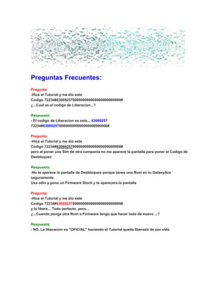 Este documento proporciona un tutorial paso a paso para liberar un Samsung Galaxy Ace de forma permanente. Explica cómo usar una aplicación de terminal emulador para acceder al directorio efs del dispositivo, ver el código de desbloqueo almacenado allí, y desbloquear el teléfono insertando una SIM de otra compañía y entrando el código de 8 dígitos. El autor afirma que siguiendo este método el teléfono quedará desbloqueado de por vida sin riesgo de daño, y proporciona capturas de pantalla antes
