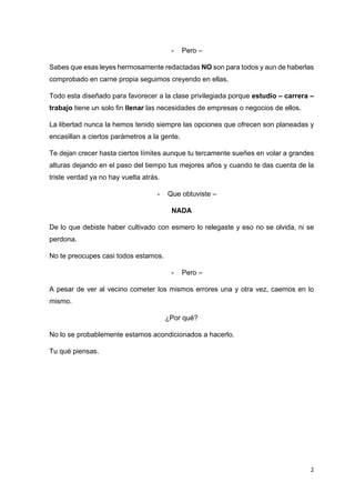 Este documento discute la noción de libertad y cómo en realidad está limitada por factores como el sexo, clase social y privilegios desde el nacimiento. Señala que la mayoría de la población tiene deficiencias en su alimentación, educación y oportunidades laborales, mientras que la clase privilegiada obtiene una "bonanza" en todos los aspectos de la vida. Aunque existen leyes que prometen derechos para todos, en realidad favorecen a la élite y encasillan a la gente dentro de parámetros establecidos, limit
