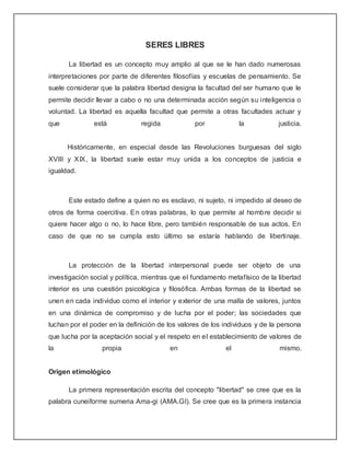 Este documento trata sobre la libertad como un concepto filosófico. En 3 oraciones resume lo siguiente: La libertad se refiere a la capacidad de decidir e independencia de coerción. Históricamente ha estado ligada a la justicia e igualdad. Existen diferentes interpretaciones como la libertad negativa de ausencia de obstáculos o la positiva de poder tomar decisiones que conduzcan a la acción.