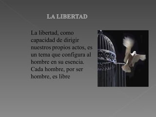 El documento discute varios temas relacionados con la libertad y la responsabilidad moral. Explora las diferentes formas de libertad como la física, política, civil y de pensamiento. También analiza el determinismo y el indeterminismo y cómo afectan la noción de libertad. Finalmente, aborda conceptos como la conciencia, la responsabilidad y la imputabilidad y cómo estos son necesarios para la ética y el orden moral.