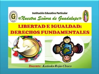 El documento habla sobre los derechos humanos y cubre los temas de la igualdad y la libertad. Explica que la igualdad ante la ley significa que la ley se aplica sin distinción y que existen diferentes formas de concebir la igualdad como la igualdad jurídica, social y de oportunidades. También define la libertad como la libertad individual, de circulación, de información y de conciencia.