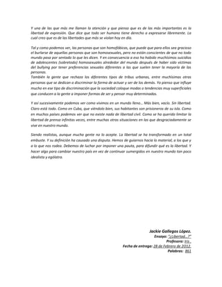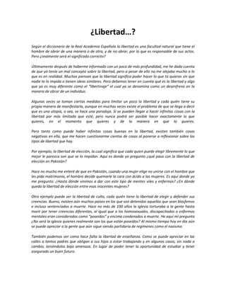 Este documento explora el concepto de libertad y argumenta que la definición de libertad es problemática. Señala que aunque la libertad implica la capacidad de elegir, en la práctica existen muchas restricciones a la libertad en todo el mundo. Por ejemplo, en algunos países las mujeres no tienen la libertad de elegir a su pareja y los homosexuales son víctimas de acoso. El documento concluye que la libertad se ha transformado en una ilusión y que se necesitan esfuerzos para promover una verdadera libertad y cambiar las