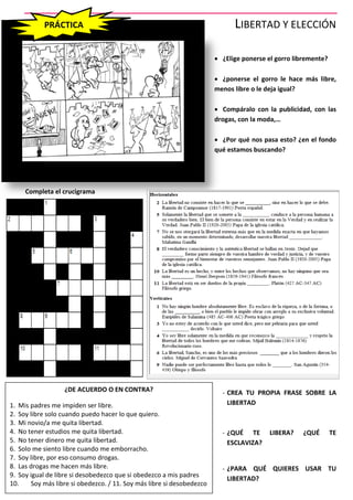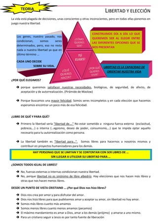 El documento trata sobre la libertad y la elección. Explica que aunque los genes y el pasado nos condicionan, somos libres de orientar nuestra propia vida al elegir entre diferentes opciones. La libertad es la capacidad de decidir sobre uno mismo y construir lo que se quiere ser mediante las elecciones diarias.