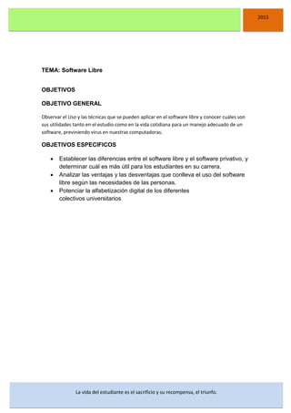 Este documento trata sobre el software libre. Sus objetivos son establecer las diferencias entre el software libre y el software privativo, analizar las ventajas y desventajas del software libre, y potenciar la alfabetización digital. Explica que el software libre puede ser copiado, modificado y redistribuido libremente, y define sus cuatro libertades principales: la libertad de ejecutar el programa con cualquier propósito, estudiar y modificar el código, redistribuir copias, y distribuir versiones modificadas.