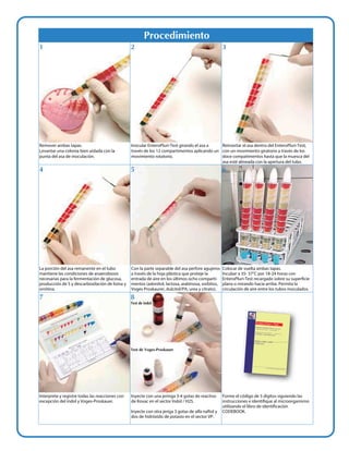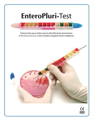 El documento describe el procedimiento para utilizar el sistema EnteroPluri-Test para identificar bacterias de la familia Enterobacteriaceae y otras bacterias Gram-negativas oxidasa-negativas en 3 pasos: 1) inocular una colonia en los 12 compartimentos del EnteroPluri-Test, 2) incubar a 35-37°C durante 18-24 horas, y 3) interpretar las reacciones e identificar la bacteria utilizando el código de 5 dígitos y el libro de identificación.