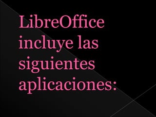 LibreOffice es una suite de oficina de código abierto gratuita que incluye un procesador de texto, hoja de cálculo, presentaciones, base de datos, editor gráfico y de fórmulas. Funciona en múltiples sistemas operativos y es la suite ofimática predeterminada en varias distribuciones de Linux. Ofrece la capacidad de importar y exportar documentos en diferentes formatos.