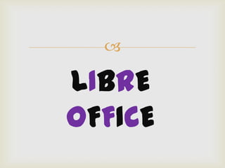 Libre Office es una suite de oficina gratuita y de código abierto disponible para múltiples sistemas operativos. Se creó en 2010 como bifurcación de OpenOffice.org y permite editar documentos en formatos estándar e importar/exportar archivos en diversos formatos adicionales. Incluye aplicaciones como Write, Calc, Impress, Base, Draw y Math.