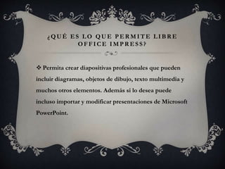 Libre Office Impress es un programa de presentaciones que permite crear diapositivas profesionales con elementos como diagramas, objetos, texto y multimedia. Ofrece la posibilidad de incluir fotos, videos, animaciones y sonidos, y exportar las presentaciones a formatos como PDF, HTML y SWF. Sus características fundamentales incluyen la interactividad y la exportación a formatos de impresión y web.