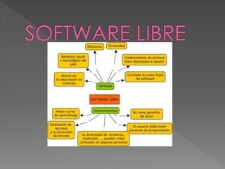 El documento describe las ventajas y desventajas del software libre y propietario. Entre las ventajas del software libre se mencionan la libertad de uso, redistribución e independencia tecnológica, mientras que entre las desventajas se señalan la dificultad en el intercambio de archivos y la mayor dificultad en la instalación y migración para el usuario común. El documento también analiza las ventajas del software propietario como el soporte de hardware y aplicaciones populares, así como sus desventajas como la depend