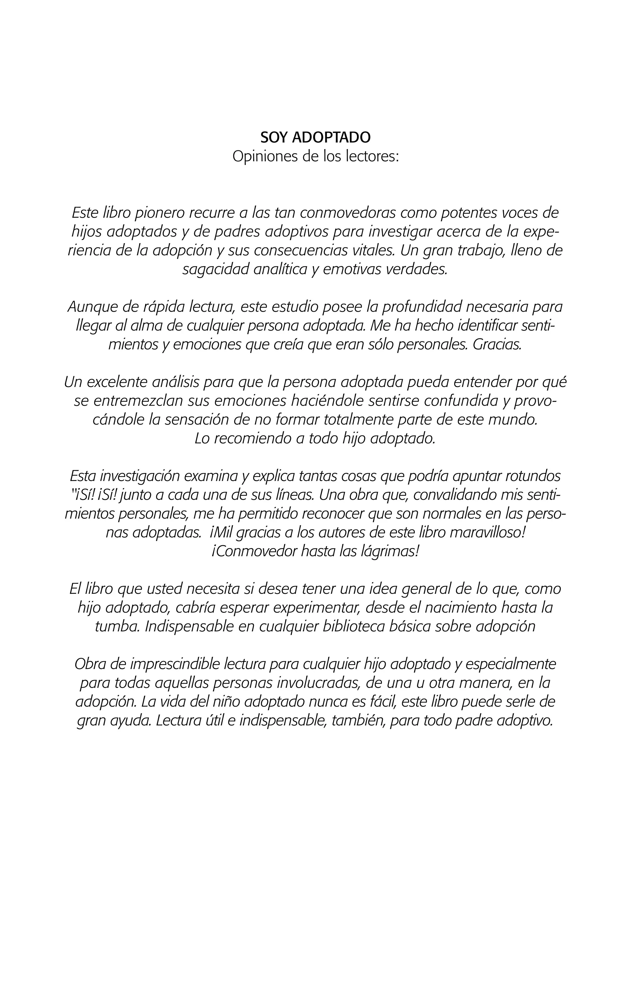 Este resumen describe las opiniones positivas de varios lectores sobre el libro "Soy Adoptado". Los lectores encontraron que el libro analiza de manera profunda las emociones y experiencias comunes de las personas adoptadas. Reconocieron sentimientos propios en el libro y lo recomendaron para cualquier hijo adoptado o persona involucrada en la adopción.