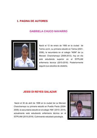 1. PAGINA DEAUTORES GABRIELA CHUCO NAVARRO Nació el 12 de enero de 1995 en la ciudad de Tarma Junín, su primaria estudió en Tarma (2001- 2006), la secundaria en el colegio “NSM” de La Merced- Chanchamayo (2008-2012), hoy en día está estudiando superior en el ISTPLAM enfermería técnica (2015-2018). Posteriormente seguirá sus estudios de obstetra. JESSI DI REYES SALAZAR Nació el 30 de abril de 1998 en la ciudad de La Merced- Chanchamayo su primaria estudió en Pueblo Pardo (2004- 2009), la secundaria estudió en el colegio “MA” (2010- 2014), actualmente está estudiando enfermería técnica en el ISTPLAM (2015-2018). Culminando estudiará psicología.