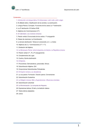 Este documento presenta la asignatura de Latín I para 1o de bachillerato. Explica los contenidos que se verán a lo largo del curso, como la introducción a la lengua latina, el alfabeto, las declinaciones, conjugaciones verbales y diferentes tipos de oraciones. También incluye información sobre la historia y desarrollo del latín desde sus orígenes hasta la actualidad.