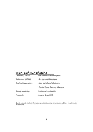 Este documento presenta un texto de instrucción para la asignatura de Matemática Básica I dirigido a estudiantes de carreras como Derecho, Administración, Contabilidad y Ciencias de la Comunicación. El texto abarca ocho capítulos que cubren temas como lógica simbólica, álgebra de conjuntos, álgebra de números, matrices, álgebra de ecuaciones, relaciones, la circunferencia y la parábola. El objetivo es proporcionar conocimientos matemáticos fundamentales de manera pro