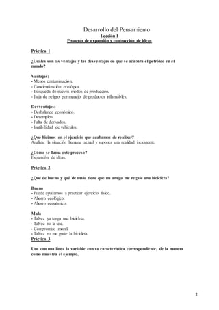 El documento presenta varias prácticas sobre procesos de pensamiento como la expansión y contracción de ideas. Las prácticas guían al lector a través de ejercicios que involucran procesos como considerar consecuencias, alternativas, prioridades y otros puntos de vista. El objetivo es enseñar estas habilidades para aplicarlas en la vida cotidiana y mejorar el desempeño personal.