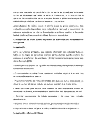 Este documento describe el enfoque formativo de la evaluación y comunicación de los logros de aprendizaje de los estudiantes. Explica que la comunicación de los logros es fundamental para la autoconcepción del estudiante, su motivación y autorregulación. También orienta a los padres y maestros e informa sobre el proceso de aprendizaje. Describe los tipos de evaluación como heteroevaluación, coevaluación y autoevaluación.