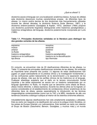 Este documento define la afasia como un trastorno del lenguaje adquirido debido a daño cerebral. Explica que la afasia se refiere específicamente a un trastorno del lenguaje oral y discute las diferencias entre afasia infantil y disfasia del desarrollo. También resume varias clasificaciones prominentes de los síndromes afásicos y reconoce que aunque los nombres pueden variar, hay acuerdo en los perfiles clínicos de los trastornos del lenguaje.