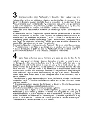 El libro arameo de Ajicar narra la historia de Ajicar, un escribano sabio que, tras la muerte del rey Senaquerib, se preocupa por su legado y decide criar a Nadín, el hijo de su hermana, como su sucesor. Sin embargo, Nadín, traiciona a Ajicar al conspirar en su contra, lo que lleva al rey Asarhaddón a ordenar su muerte. A pesar de esto, un oficial le ofrece un rescate y Ajicar es ocultado, mientras Nadín logra engañar al rey sobre su destino.