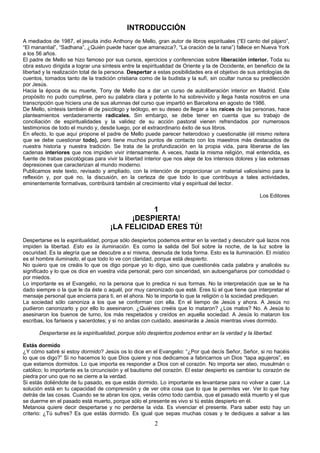 Este documento presenta un resumen del libro "Autoliberación Interior" de Anthony de Mello. Habla sobre la necesidad de despertar interiormente para alcanzar la verdadera libertad y felicidad, más allá de las ataduras mentales y emocionales. Propone que el sufrimiento es producto de la mente dormida y que al despertar y aceptar la realidad tal cual es, el dolor existe pero no el sufrimiento. Resalta la importancia de vivir en el presente y no aferrarse al pasado, y que lo verdaderamente