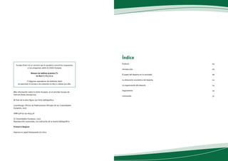 Este documento presenta un resumen del Libro Blanco sobre el deporte de la Comisión Europea. En primer lugar, introduce el papel fundamental del deporte en la sociedad europea y los retos a los que se enfrenta. Luego, resume brevemente la dimensión económica del deporte y la organización del deporte en Europa. Por último, señala que la Comisión seguirá este tema y podría proponer más medidas en el futuro.