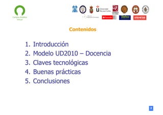El documento presenta las claves para la docencia en la era digital según el modelo UD2010. Propone el uso de tecnologías como el eLearning 2.0 y contenidos abiertos para flexibilizar la educación y eliminar barreras. También destaca la importancia del factor humano en la enseñanza online y promueve entornos de aprendizaje social. Concluye que la tecnología debe mejorar el aprendizaje más que cambiar solo el método de enseñanza.