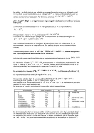 Este documento trata sobre conceptos relacionados con la acidez y el pH en sistemas biológicos. Explica que el jugo vacuolar de las células vegetales es más ácido que el citoplasma debido a la acumulación de ácidos orgánicos. También describe cómo los cambios de pH afectan la actividad enzimática y cómo los sistemas tampón mantienen el pH estable. Finalmente, presenta ecuaciones para calcular el pH, la concentración de protones y la relación entre pH y pKa en soluciones amortigu
