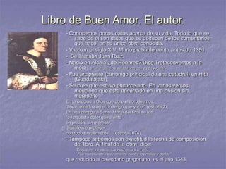 El documento resume la vida y obra del autor Juan Ruiz, conocido como el Arcipreste de Hita. En 3 oraciones: 1) Poco se sabe de la vida de Juan Ruiz salvo que vivió en el siglo XIV en Alcalá de Henares y fue arcipreste en Hita. 2) Su única obra conocida es el Libro de Buen Amor, que narra las aventuras amorosas de un arcipreste y usa diversos géneros literarios como marco. 3) La intención didáctica de la obra es ambigua, pues también inclu