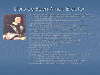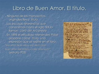El Libro de Buen Amor es una obra única del siglo XIV escrita por Juan Ruiz, arcipreste de Hita. Narra las aventuras amorosas, casi siempre fallidas, de un arcipreste y su búsqueda de consejo en la alcahueta Trotaconventos. Incluye diversos géneros literarios como fábulas, apólogos y poemas. Su intención didáctica sobre el amor correcto contrasta con escenas de seducción, mostrando la ambigüedad del autor.