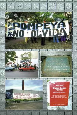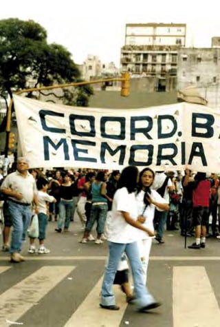 Este documento presenta un resumen de las actividades de la Coordinadora Barrios por la Memoria y la Justicia, la cual reúne a comisiones de diferentes barrios de la ciudad de Buenos Aires. El objetivo es reconstruir las historias de vida de militantes populares detenidos-desaparecidos o asesinados durante la última dictadura militar en Argentina, a través de entrevistas con familiares y vecinos. Se colocan placas conmemorativas en los lugares donde vivieron o trabajaron para mantener viva su memoria. El libro