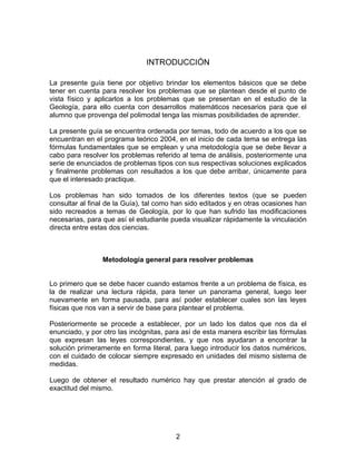Este documento presenta problemas resueltos de física I, incluyendo mecánica, movimiento ondulatorio y calor. Está organizado en 14 temas con conceptos, fórmulas y problemas con soluciones explicadas de cada tema. Los problemas abarcan una variedad de temas de física y algunos están relacionados con la geología. El objetivo es brindar herramientas para resolver problemas físicos aplicados a la geología.