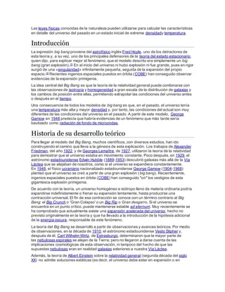 La teoría del Big Bang es el modelo cosmológico predominante que afirma que el universo se originó a partir de una singularidad extremadamente densa y caliente hace aproximadamente 13,800 millones de años y desde entonces se ha estado expandiendo. La evidencia que apoya esta teoría incluye la radiación de fondo de microondas, el corrimiento al rojo de las galaxias y la formación de elementos químicos. Aunque hubo debates iniciales, la acumulación de evidencia observacional ha llevado a un fuerte consenso sobre la validez