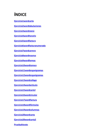 Este documento es un índice de 20 ejercicios de Word realizados por una estudiante. Incluye ejercicios sobre cartas, tabulaciones, menús, horarios, facturas numeradas y no numeradas, carreras deportivas, reservas, formas, torneos deportivos, organigramas, collages, artículos, carteles, circulares, fórmulas y columnas de texto. El documento finaliza con 3 pruebas de texto.