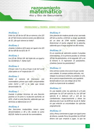 Este documento presenta 36 problemas matemáticos relacionados con fracciones. Los problemas involucran sumas, restas, multiplicaciones y divisiones de fracciones, así como la resolución de ecuaciones y sistemas de ecuaciones fraccionarias. Los problemas también tratan temas como porcentajes, relaciones entre cantidades, llenado y vaciado de depósitos, y cálculo de fechas usando fracciones.