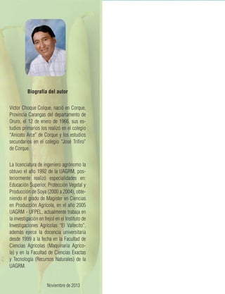 Este documento describe el cultivo del frejol en Bolivia. Explica la taxonomía, nombres y origen del frejol, así como su distribución geográfica y rol como alimento básico. Luego describe la botánica, hábitos de crecimiento y fenología del frejol, así como las clasificaciones de variedades. Finalmente, analiza zonas de producción, superficie sembrada, sistemas de producción, épocas de siembra, variedades, factores que afectan la producción, cosecha, destino de la producción y
