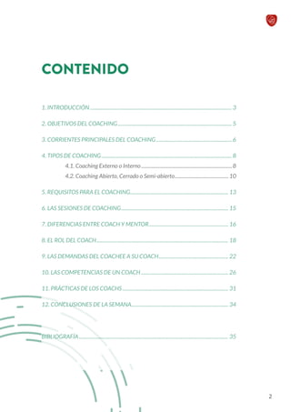 Este documento presenta los fundamentos del coaching. Explica que el coaching tiene como objetivos principales lograr que una persona sea efectiva al saber, poder y querer, así como expandir estas áreas. También describe las dos corrientes principales del coaching, directivo y ontológico, y diferentes tipos como coaching externo e interno, y abierto, cerrado o semiabierto. Finalmente, destaca la confianza como requisito fundamental para que el proceso de coaching sea exitoso.