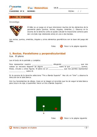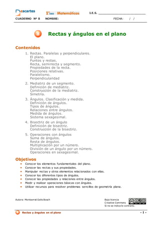Este documento presenta información sobre rectas y ángulos en el plano. Contiene cinco secciones principales: 1) rectas, paralelismo y perpendicularidad; 2) mediatriz de un segmento; 3) ángulos, clasificación y medida; 4) bisectriz de un ángulo; y 5) operaciones con ángulos. El objetivo es que los estudiantes conozcan los elementos básicos del plano, como puntos, rectas y sus propiedades, y puedan manipular, medir y realizar operaciones con rectas y ángulos.