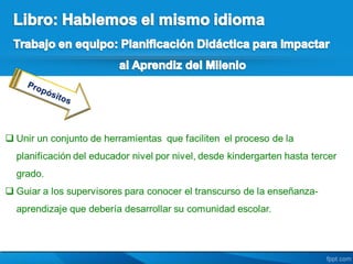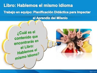 Este documento presenta un resumen del libro "Hablemos el mismo Idioma: Trabajo en Equipo: Planificación Didáctica para Impactar al Aprendiz del Milenio" de la autora Zuleika Budet. El libro ofrece una guía sobre cómo desarrollar una planificación didáctica estructurada para impactar de manera holística el desarrollo de cada estudiante. Explica el proceso de planificación dividido en etapas de conocer, realizar, estudiar, crear, verificar y evaluar, con el objet