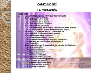 El documento describe la expiación en el Antiguo y Nuevo Testamento. En el Antiguo Testamento, los sacrificios de animales fueron ordenados por Dios como una señal de la expiación perfecta que vendría en Cristo. Estos sacrificios prepararon al pueblo para entender la muerte de Cristo como la verdadera expiación por los pecados. En el Nuevo Testamento, la muerte de Cristo proporcionó el perdón de pecados, la liberación del pecado y la muerte, y la vida eterna.