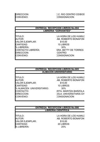 El documento contiene información sobre la entrega y recepción de libros a varias librerías y un almacén universitario en Guayaquil y Quito. Se entregaron un total de 89 libros titulados "La Hora de los Humildes" de Roberto Bonafont a un precio de $10 cada uno, con un porcentaje de 30% para las librerías. Los libros fueron entregados bajo consignación a 6 librerías en Guayaquil y 6 en Quito.