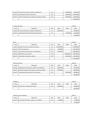 Este documento presenta un resumen del libro mayor de una empresa. Muestra las transacciones realizadas en la caja, capital, compras, cuentas por pagar, ventas, cuentas por cobrar, banco, efectos por cobrar, mobiliario, gastos de servicios básicos, comisiones de ventas, despedido de papel, terreno, hipoteca por pagar, flete de ventas y gastos de sueldos y salarios durante un mes. Cada transacción incluye la fecha, explicación, referencia débito/crédito,